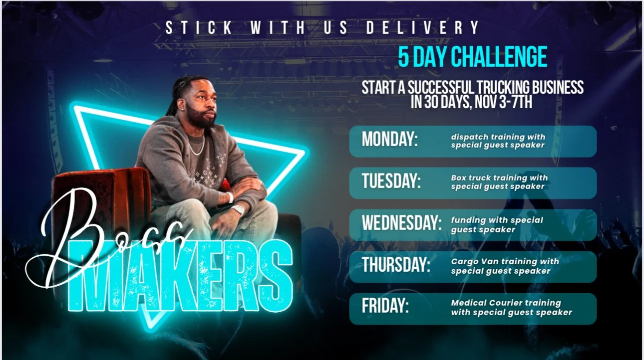 FREE MASTER CLASS OCTOBER 19TH AT 11AN EST BOSS MAKERS 5 DAY CHALLENGE NOV 3RD TO 7TH STARTS AT 7PM SIGN UP TODAY ‼️ 1% CLUB MENTORSHIP PROGRAM FUNDING INCLUDED Mentorship Program TIER 1 & 2 HOLD YOUR HAND!!! Text: READY TO: 772-362-1777 Book a one on one Consultation 3 PACK MEDICAL COURIER COURSE PLUS 2 MASTER CLASS WITH SDS-RX VICE PRESIDENT TODD FILTER WAS $499 NOW ONLY $89 HIPAA and Bloodborne Pathogen Certifications (use code: Stickwithus Cargo Van COURSE FOR CARGO VANS AND BOX TRUCKS LOADS *FREE WEBINAR REPLAY* PERSONAL VEHICLE & CARGO VAN FACTORING COMPANY OTR SOLUTIONS SIGN UP TODAY ‼️ Stay up to date with Stick with us Delivery Sign up with your email address to receive news and updates. First Name Last Name Email Address Sign Up We respect your privacy. We will not sell or share your information! Thank you for signing up to stay up to date with Stick With Us Delivery!